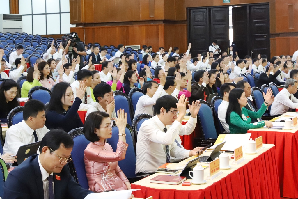 | Đại biểu HĐND tỉnh khóa XIX biểu quyết thông qua nghị quyết tại kỳ họp. |